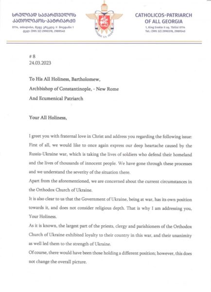 Στις 24 Μαρτίου 2023 ο Προκαθήμενος της εν Γεωργία Ορθιοδόξου Εκκλησίας κ.κ. Ηλίας απέστειλε επιστολή προς τον Παναγιώτατο Οικουμενικό Πατριάρχη κ.κ. Βαρθολομαίο στην οποία αναφερόταν στα σχετικά με όσα συμβαίνουν στη Λαύρα των Σπηλαίων στο Κίεβο.