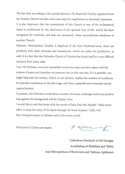 Επιστολή του Πατριάρχη Γεωργίας στον Οικουμενικό Πατριάρχη