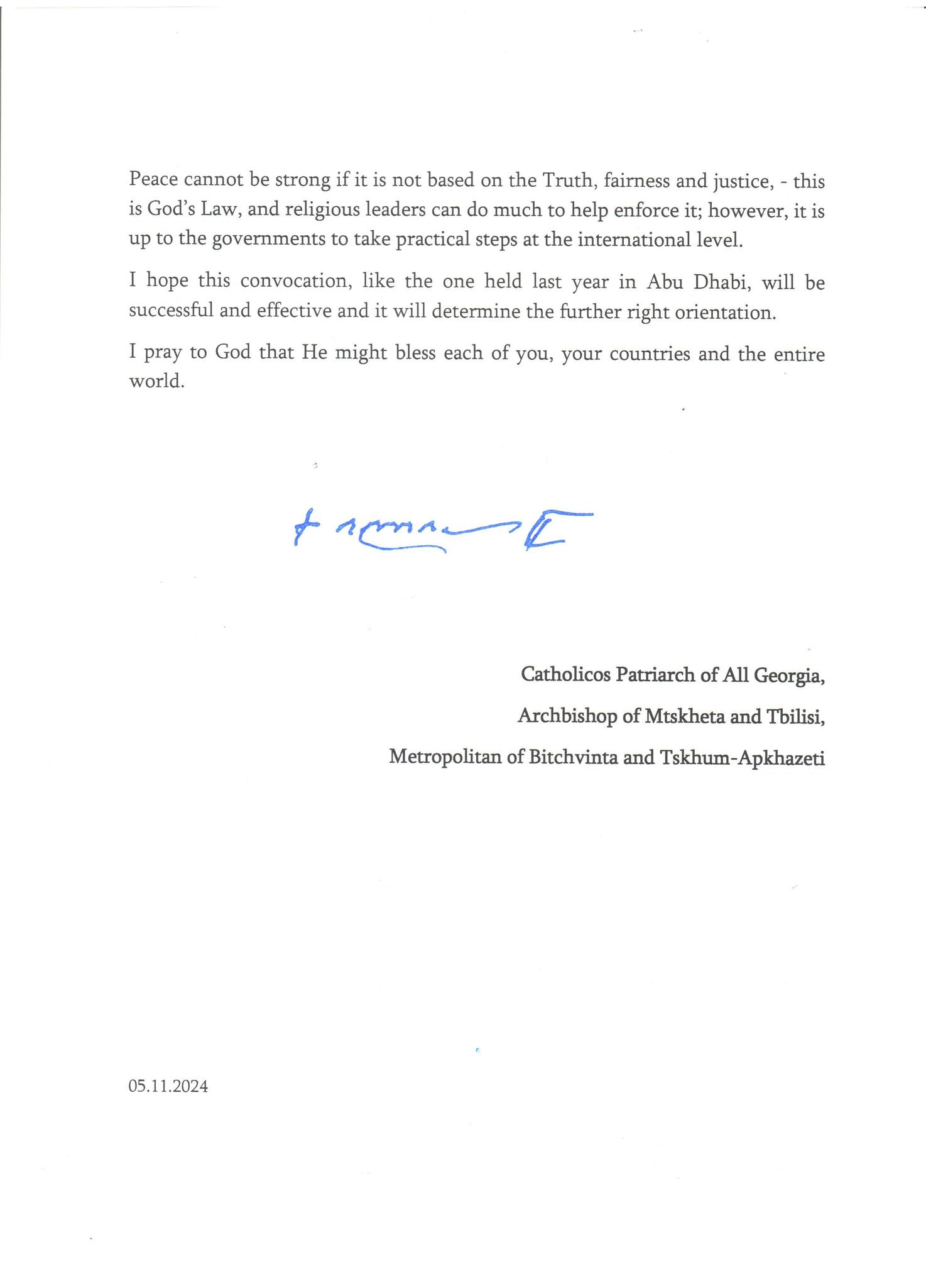 Ο Πατριάρχης Γεωργίας κ.κ. Ηλίας με αφορμή διάσκεψη θρησκευτικών ηγετών με θέμα «Η Παγκόσμια Θρησκεία για έναν Πράσινο Πλανήτη», που πραγματοποιείται στο Μπακού του Αζερμπαϊτζάν από τις 5 έως τις 6 Νοεμβρίου, κάλεσε τις κυβερνήσεις να λάβουν πρακτικά μέτρα σε διεθνές επίπεδο για τη διασφάλιση της ειρήνης η οποία βασίζεται στην τήρηση των Νόμων του Θεού που είναι η Αλήθεια και η Δικαιοσύνη.
