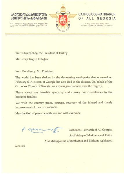 “Ταρακουνήθηκε ο κόσμος από τον καταστροφικό σεισμό της 6ης Φεβρουαρίου. Ένας πολίτης της Γεωργίας σκοτώθηκε από τη θεομηνία. Εκ μέρους της Γεωργιανής Ορθόδοξης Εκκλησίας και εμού, εκφράζω τη βαθιά μου θλίψη για την τραγωδία. Παρακαλώ δεχτείτε την εγκάρδια συμπάθειά μας και τα συλλυπητήρια για τις οικογένειες των εκλιπόντων. Εύχομαι στη χώρα ειρήνη, κουράγιο, ανάρρωση των τραυματιών και έγκαιρη αποκατάσταση των ζημιών”, αναφέρει.