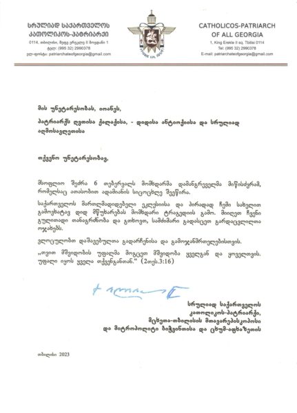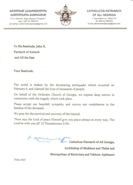 Συλλυπητήριο μήνυμα έστειλε ο Πατριάρχης Γεωργίας κ.κ. Ηλίας στον Πατριάρχη Αντιοχείας κ.κ. Ιωάννη με αφορμή τον καταστροφικό σεισμό στη Συρία που είχε ως τραγικό απολογισμό τον θάνατο χιλιάδων ανθρώπων.