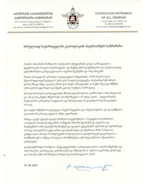 “Η πρόσφατη φυσική καταστροφή στη Ράτσα είναι μια μεγάλη δοκιμασία για τη χώρα. Ολόκληρη η Γεωργία, αλλά και εμείς, λυπόμαστε βαθιά και εκφράζουμε τα θερμά μας συλλυπητήρια στα μέλη της οικογένειας και τους συγγενείς των εκλιπόντων“, είπε στην αρχή του μηνύματός του ο Μακαριώτατος, με αφορμή το ότι σήμερα κηρύχθηκε ημέρα εθνικού πένθους στη χώρα.