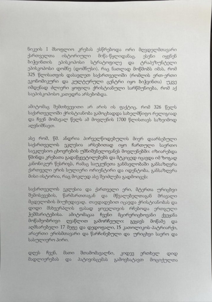 “Στην Α’ Οικουμενική Σύνοδο της Νικαίας συμμετείχαν δύο ιερείς από την ιστορική γη της Γεωργίας. Αυτοί ήταν ο Επίσκοπος της Πιτίουντ (Πιτσούντα ή Μπισβίντα, Bichvinta) Στρατοφίλος και ο Επίσκοπος της Τραπεζούντας (Τραπεζούντα, Turkuaz/Trabzon) Δομνός, που αποδεικνύει ξεκάθαρα ότι επί 325 χρόνια στη δυτική Γεωργία (ένα από τα οικονομικά και πολιτιστικά κέντρα της Μπιζβίντα) η χριστιανική πίστη ήταν τόσο ισχυρή που εδώ υπήρχε Μητροπολιτικός Ναός“, επεσήμανε.