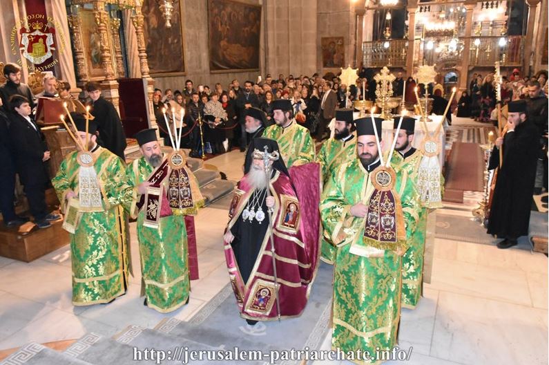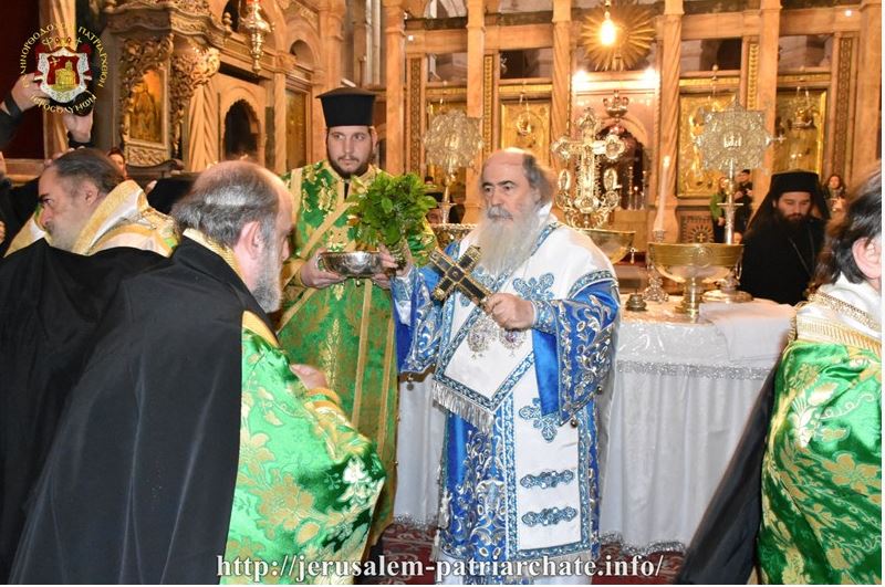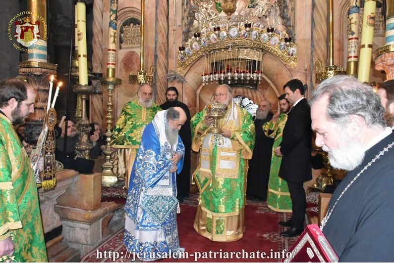 Τῶν πιστῶν ἁγιασθέντων ἢ καί λαβόντων ἁγιασμόν διά τάς οἰκίας αὐτῶν, ἐτελέσθη ἡ θεία Λειτουργία τοῦ Ἁγίου Ἰωάννου τοῦ Χρυσοστόμου εἰς τόν Πανάγιον Τάφον, προεξάρχοντος τοῦ Μακαριωτάτου καί συλλειτουργούντων Αὐτῷ τῶν Ἀρχιερέων τοῦ Πατριαρχείου Σεβασμιωτάτου Μητροπολίτου Καπιτωλιάδος κ. Ἡσυχίου, τῶν Σεβασμιωτάτων Ἀρχιεπισκόπων Κωνσταντίνης κ. Ἀριστάρχου, Θαβωρίου κ. Μεθοδίου, Σεβαστείας κ. Θεοδοσίου, Λύδδης κ. Δημητρίου, τοῦ Σεβασμιωτάτου Μητροπολίτου Ἑλενουπόλεως κ. Ἰωακείμ και τοῦ παρεπιδημοῦντος ἐκ τῆς Ἐκκλησίας τῆς Ἑλλάδος Σεβασμιωτάτου Μητροπολίτου Κερκύρας, Παξῶν και διαποντίων νήσων κ. Νεκταρίου, Ἁγιοταφιτῶν Ἱερομονάχων, ὧν πρῶτος ὁ Γέρων Καμαράσης Ἀρχιμανδρίτης Νεκτάριος, Ἱερέων Ὀρθοδόξων Ἐκκλησιῶν, τοῦ Ἀρχιδιακόνου π. Μάρκου καί ἄλλων πέντε διακόνων, ψάλλοντος τοῦ Πρωτοψάλτου τοῦ Πανιέρου Ναοῦ τῆς Ἀναστάσεως κ. Κωνσταντίνου Σπυροπούλου, παρουσίᾳ τοῦ Γενικοῦ Προξένου τῆς Ἑλλάδος εἰς τά Ἱεροσόλυμα κ. Χρήστου Σοφιανοπούλου καί ἐν συμμετοχῇ πολυπληθῶν προσκυνητῶν ἐκ διαφόρων χωρῶν.