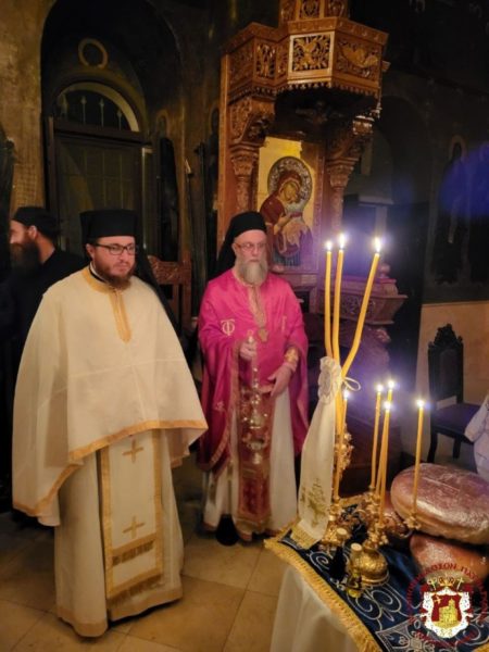 Εὔχεσθε ὅπως, διά πρεσβειῶν τῆς Ὑπεραγίας Δεσποίνης ἡμῶν Θεοτόκου τῆς Χοζοβιωτίσσης καί τοῦ σήμερον τιμωμένου Ἁγίου Ἰωάννου τοῦ Νέου, βιώσωμεν καί ἡμεῖς τήν ὑψοποιόν Ταπείνωσιν καί ἀξιωθῶμεν τῆς ἀλήκτου τρυφῆς τοῦ Παραδείσου, δι’ εὐχῶν τῶν ἁγίων τῆς Ὑμετέρας Μακαριότητος, Ἀμήν!”