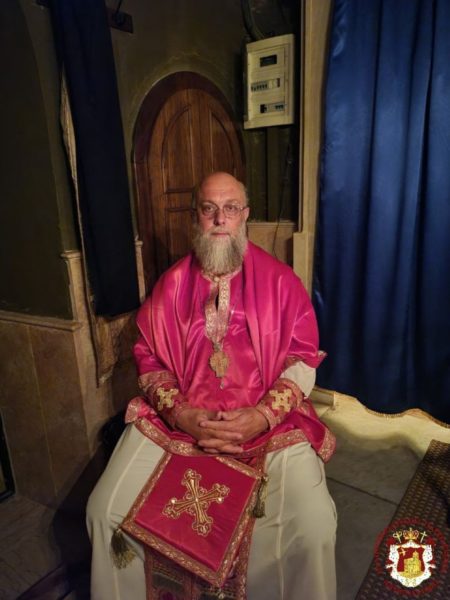 Κατά την υποδοχή του Μακαριωτάτου, ο ηγούμενος και ανακαινιστής της Μονής Αρχιμανδρίτης π. Κωνσταντίνος προσφώνησε διά της κάτωθι προσφωνήσεως αυτού: