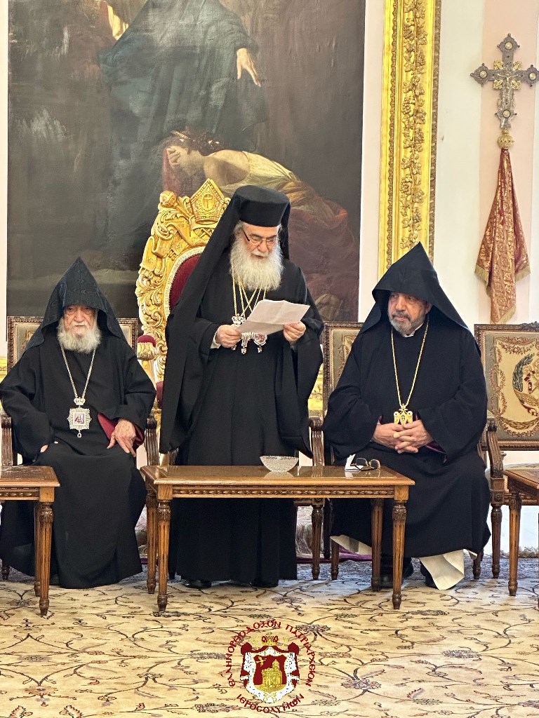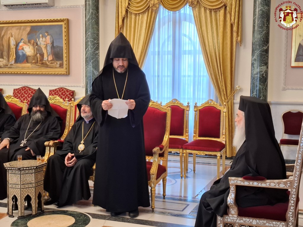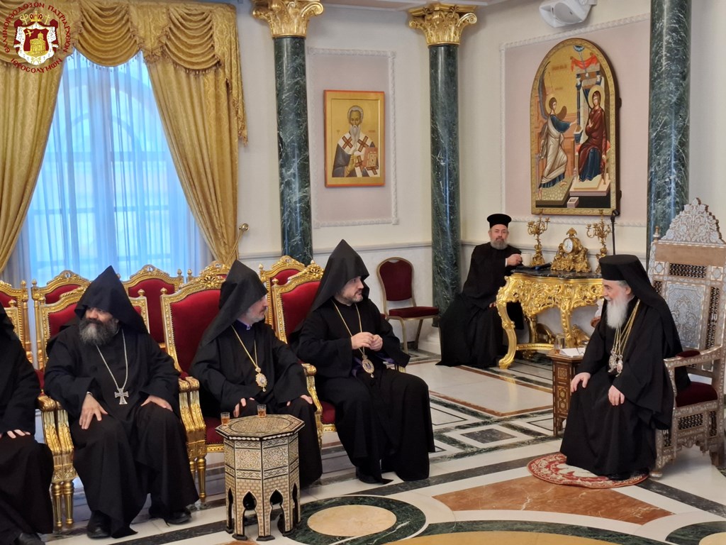 Τo πρωΐ της Τετάρτης της Διακαινησίμου, 10/23 Απριλίου 2025, αντιπροσωπεία του Αρμενικού Πατριαρχείου στα Ιεροσόλυμα υπό τον Σεβασμιώτατο Επίσκοπο Γκουριόν επισκέφθηκε το Πατριαρχείο για ευχές για την χαρμόσυνη εορτή του Πάσχα και έγινε ένθερμα δεκτή από τον Πατριάρχη Ιεροσολύμων κ.κ. Θεόφιλο και τους Αγιοταφίτες Πατέρες. Τους εκπροσώπους του Αρμενικού Πατριαρχείου προσεφώνησε ο Μακαριώτατος στα αγγλικά.