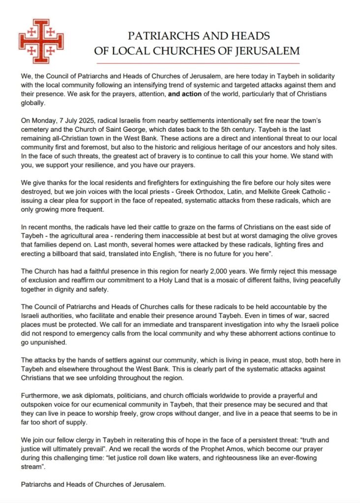 Τήν Δευτέραν, 7ην Ἰουλίου 2025, ἀκραῖα φανατικά στοιχεῖα, προερχόμενα ἐκ πλησιοχώρων ἐποικισμῶν προεκάλεσαν σκοπίμως πυρκαϊάν εἰς τό Νεκροταφεῖον τῆς πόλεως καί εἰς τόν Ναόν τοῦ Ἁγίου Γεωργίου, ὁ ὁποῖος χρονολογεῖται ἀπό τόν 5ον αἰῶνα. Ἡ πόλις Τάϋμπε εἶναι ἡ τελευταία ἐξ ὁλοκλήρου Χριστιανική πόλις ἐν τῇ Δυτικῇ Ὄχθῃ. Αἱ ἐνέργειαι αὗται ἀποτελοῦν ἄμεσον καί σκόπιμον ἀπειλήν, οὐ μόνον διά τήν τοπικήν Κοινότητα, ἀλλά καί διά τήν ἱστορικήν καί θρησκευτικήν κληρονομίαν τῶν προγόνων ἡμῶν καί τῶν ἱερῶν τόπων ἡμῶν. Ἔναντι τοιούτων ἀπειλῶν, ἡ κραταιοτέρα πρᾶξις γενναιότητος εἶναι τό ἐμμένειν τινά ἀποκαλεῖν τοῦτον τόν τόπον ὡς τήν ἑστίαν αὐτοῦ. Ἱστάμεθα παρά τῷ πλευρῷ ὑμῶν, σᾶς ὑποστηρίζομεν ἐν τῷ ἀγῶνι – τῇ ἀντιστάσει ὑμῶν, εὐλογοῦμεν ὑμᾶς καί εὐχόμεθα δι’ ὑμᾶς.