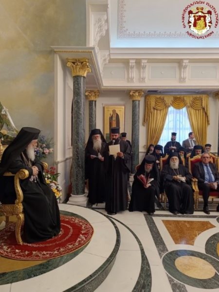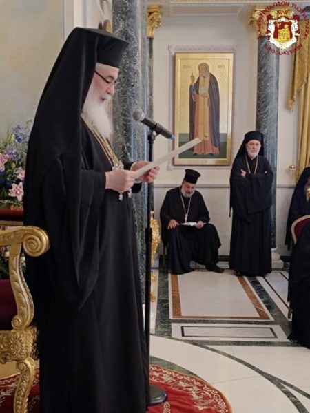 Το διαρρεύσαν έτος από την προηγούμενη επέτειο της ενθρονίσεώς Σας, υπήρξε πλήρες αντιξοοτήτων, προκλήσεων, απογοητεύσεων και ανησυχίας. Ευχόμασταν η πολεμική σύγκρουση να τερματισθεί. Αντιθέτως, ενετάθη και διεχύθη στην ευρύτερη περιοχή, με ανυπολόγιστες πλέον καταστροφές και έξαρση του ανθρωπίνου πόνου. Η συγκυρία αποτελεί ορόσημο στην πολιτική ιστορία της Μέσης Ανατολής, όπου γράφονται δυστυχώς νέα θλιβερά και αιματηρά κεφάλαια. Ακραίος εθνικισμός, μισαλλοδοξία και φυλετισμός δοκιμάζουν την ισχύ θεμελιωδών αρχών και κανόνων και καθιστούν ολοένα επισφαλέστερη την πολυπόθητη για εμάς ειρηνική συνύπαρξη στην Αγία Γη.