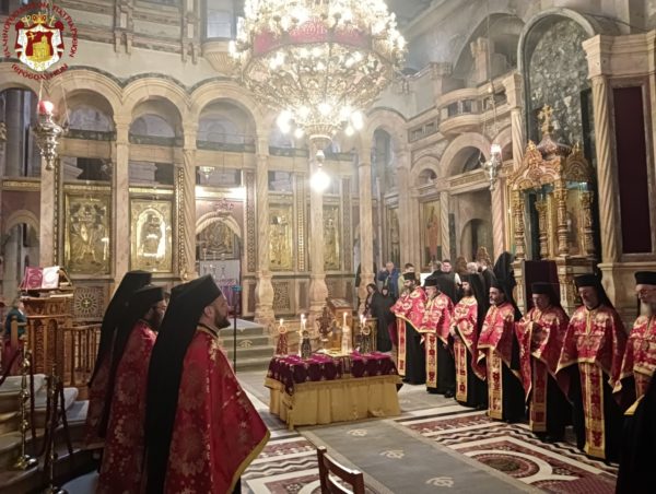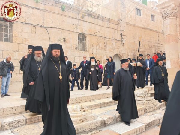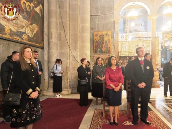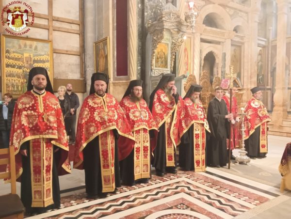 Της Δοξολογίας προεξήρχε ο Μακαριώτατος Πατριάρχης Ιεροσολύμων κ.κ. Θεόφιλος Γ’ συνιερουργούντων Αρχιερέων και Ιερομονάχων της Αγιοταφιτικής Αδελφότητος, παρουσία του Γενικού Προξένου της Ελλάδος στα Ιεροσόλυμα κ. Ευαγγέλου Βλιώρα και μελών του Ελληνικού Γενικού Προξενείου, ψάλλοντος του Σεβασμιωτάτου Αρχιεπισκόπου Μαδάβων κ. Αριστοβούλου και του κ. Βασιλείου Γκοτσοπούλου και προσευχομένων των μελών της Ελληνικής Παροικίας καθώς και προσκυνητών.