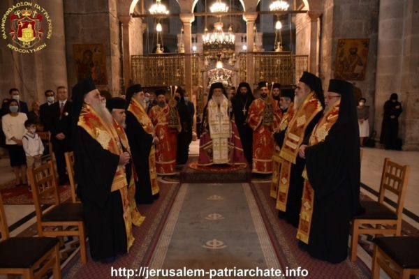 Στη Δοξολογία χοροστάτησε ο Μακαριώτατος Πατριάρχης Ιεροσολύμων κ. Θεόφιλος με συγχοροστατούντων Αγιοταφιτών Αρχιερέων και πατέρων, ενώ παραβρέθηκε και ο Γενικός Πρόξενος της Ελλάδος στα Ιεροσόλυμα.