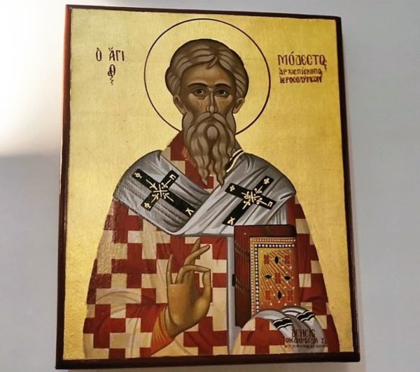 Κατά τήν ἑορτήν ταύτην ἡ Ἐκκλησία, ἰδίᾳ δέ ἡ τῶν Ἱεροσολύμων, ἀναμιμνῄσκεται τόν ἅγιον Μόδεστον ὡς μοναχόν τῆς Ἱερᾶς Μονῆς τοῦ Ἀββᾶ Θεοδοσίου τοῦ Κοινοβιάρχου, ἐκ τῆς ὁποίας ἐκλήθη καί ὑπηρέτησε τήν Ἐκκλησίαν Ἱεροσολύμων ὡς ἐπίσκοπος αὐτῆς καί Πατριάρχης, ὡς ἀρωγός καί ὡς ἄγγελος παραμυθίας, ὁ θεραπεύων τάς πληγάς εἰς ζωάς ἀνθρώπων καί εἰς καταστροφάς Μονῶν, καί Ἐκκλησιῶν ἐκ τῆς Περσικῆς εἰσβολῆς εἰς Παλαιστίνην τό ἔτος 614 μ.Χ. ὁ καί προστάτης τῶν ὑποζυγίων καί κτηνῶν.