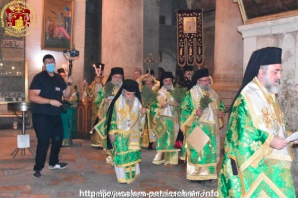 Την Κυριακή, κυριώνυμο ημέρα της εορτής, τελέστηκε Θεία Λειτουργία στο Καθολικό του Ναού της Αναστάσεσως προεξαρχόντους του Μακαριωτάτου Πατριάρχου Ιεροσολύμων κ.κ. Θεοφίλου με συλλειτουργούς τον Σεβασμιώτατο Μηητροπολίτη Καπιτωλιάδος κ. Ησυχίου και τους Σεβασμιωτάτους Αρχιεπισκόπους Γεράσων κ. Θεοφάνη, Κωνσταντίνης κ. Αρίσταρχο, Σεβαστείας κ. Θεοδόσιο, Πέλλης κ. Φιλουμένο, τον Σεβασμιώτατο Μητροπολίτη Ελενουπόλεως κ. Ιωακείμ και τον Σεβασμιώτατο Αρχιεπίσκοπο Μαδάβων κ. Αριστόβουλο. Παρών ήταν και ο Γενικός Πρόξενος της Ελλάδος στα Ιεροσόλυμα κ. Ευάγγελος Βλιώρας με μέλη του Ελληνικού Γενικού Προξενείου και ελάχιστοι πιστοί λόγω των μέτρων προστασίας από την πανδημία.