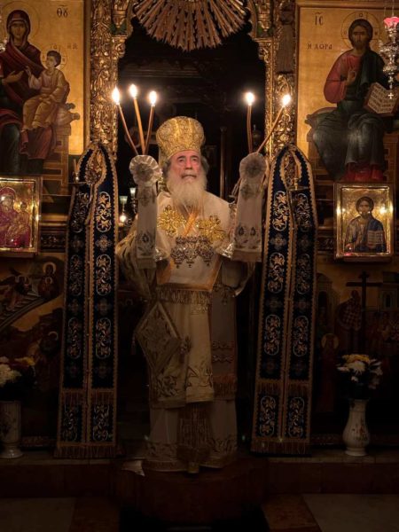 Διό καί ἡμεῖς, οἱ τιμῶντες σήμερον τήν σεπτήν τοῦ ἡγιασμένου Πατρός ἡμῶν Σάββα μνήμην παρακαλέσωμεν αὐτόν, ἵνα σύν ταῖς πρεσβείαις τῆς ὑπερευλογημένης Θεοτόκου καί ἀειπαρθένου Μαρίας, ἱκετεύῃ Κυρίῳ τῷ Θεῶ ἡμῶν ὑπέρ τῶν ψυχῶν ἡμῶν ὑπέρ εἰρήνης ἐν τῇ περιοχῇ ἡμῶν καί ὑπέρ τοῦ καταξιωθῆναι ἑορτάσαι τό μέγα καί ἄρρητον μυστήριον τῆς θείας Οἰκονομίας, τήν Γέννησιν τοῦ Θεοῦ καί Σωτῆρος ἡμῶν Χριστοῦ ἐν αὐτῷ τούτῳ τῷ σπηλαίῳ τῆς Βηθλεέμ.