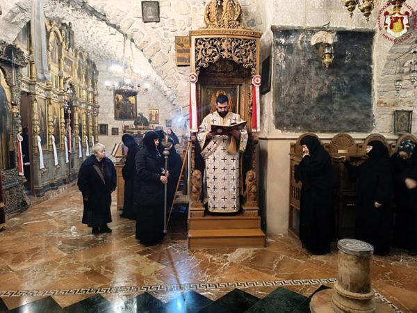 Προς τιμή του Αγίου τελέσθηκε ολονύκτια αγρυπνία στην Ιερά αυτού Λαύρα προεξάρχοντος του Μακαριωτάτου Πατριάρχου Ιεροσολύμων κ.κ. Θεοφίλου, συλλειτουργούντων του Σεβασμιωτάτου Αρχιεπισκόπου Μαδάβων κ. Αριστοβούλου ως Αρχιερέα της σειράς, του Γέροντος Αρχιγραμματέα Σεβασμιωτάτου Αρχιεπισκόπου Κωνσταντίνης κ. Αριστάρχου και του Σεβασμιωτάτου Μητροπολίτου Ελενουπόλεως κ. Ιωακείμ, Αγιοταφιτών Ιερομονάχων και Αραβοφώνων και Ρωσοφώνων Ιερέων. Τους ιερούς ύμνους απέδωσαν ο Γραμματέας της Αγίας και Ιεράς Συνόδου Ιεροδιάκονος π. Συμεών ελληνιστί δεξιά και η Αραβική χορωδία αριστερά.