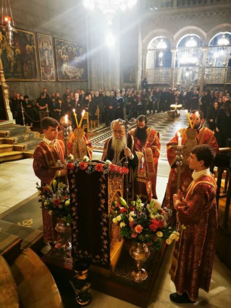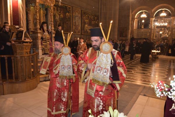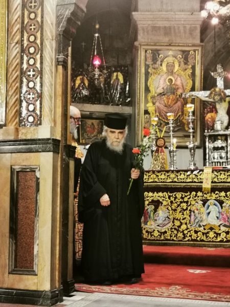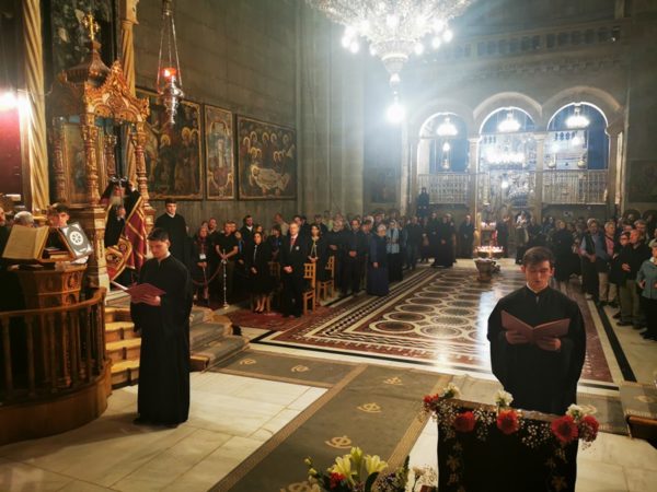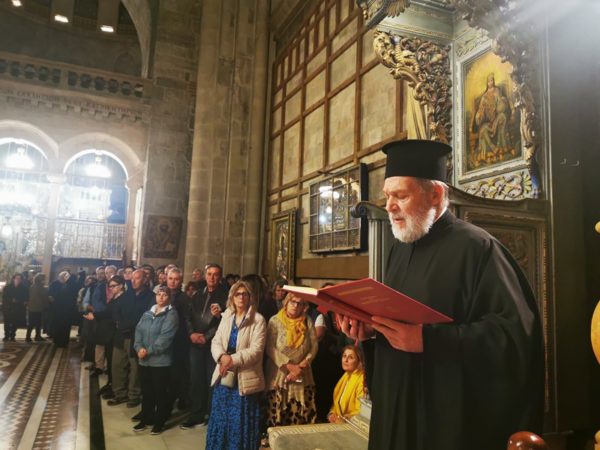 Το απόγευμα της Παρασκευής, 18 Φεβρουαρίου/3 Μαρτίου 2023, στο Καθολικό του Ναού της Αναστάσεως και στο πλαίσιο της Ακολουθίας του Μικρού Αποδείπνου και του Κανόνος «Ανοίξω το Στόμα μου» ανεγνώσθη η Α’ Στάσις των Χαιρετισμών του Ακαθίστου Ύμνου, προεξάρχοντος του Πατριάρχου Ιεροσολύμων κ.κ. Θεοφίλου, συμπροσευχομένων Αγιοταφιτών Πατέρων, του Γενικού Προξένου της Ελλάδος στα Ιεροσόλυμα κ. Ευαγγέλου Βλιώρα και ευλαβών Χριστιανών, προς τους οποίους μετά το πέρας της Ακολουθίας μίλησεν ο Μακαριώτατος.