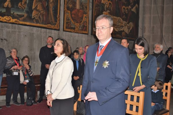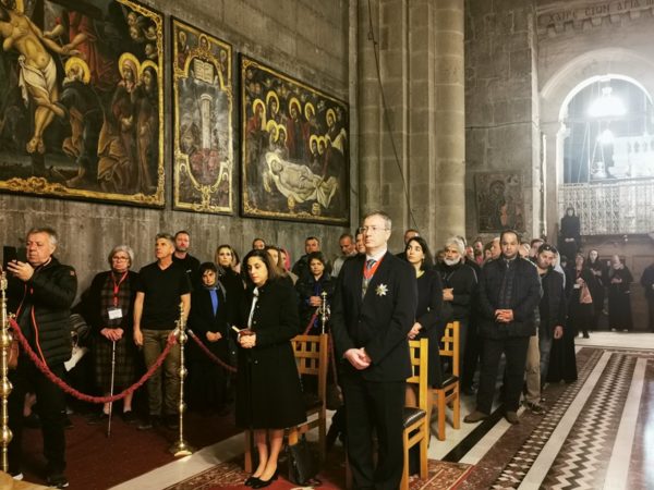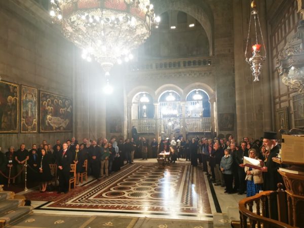 Το απόγευμα της Παρασκευής, 18 Φεβρουαρίου/3 Μαρτίου 2023, στο Καθολικό του Ναού της Αναστάσεως και στο πλαίσιο της Ακολουθίας του Μικρού Αποδείπνου και του Κανόνος «Ανοίξω το Στόμα μου» ανεγνώσθη η Α’ Στάσις των Χαιρετισμών του Ακαθίστου Ύμνου, προεξάρχοντος του Πατριάρχου Ιεροσολύμων κ.κ. Θεοφίλου, συμπροσευχομένων Αγιοταφιτών Πατέρων, του Γενικού Προξένου της Ελλάδος στα Ιεροσόλυμα κ. Ευαγγέλου Βλιώρα και ευλαβών Χριστιανών, προς τους οποίους μετά το πέρας της Ακολουθίας μίλησεν ο Μακαριώτατος.