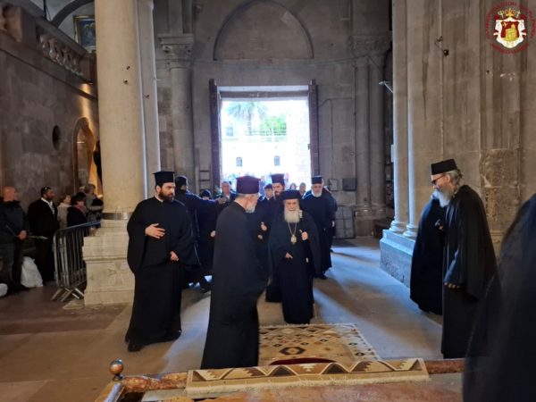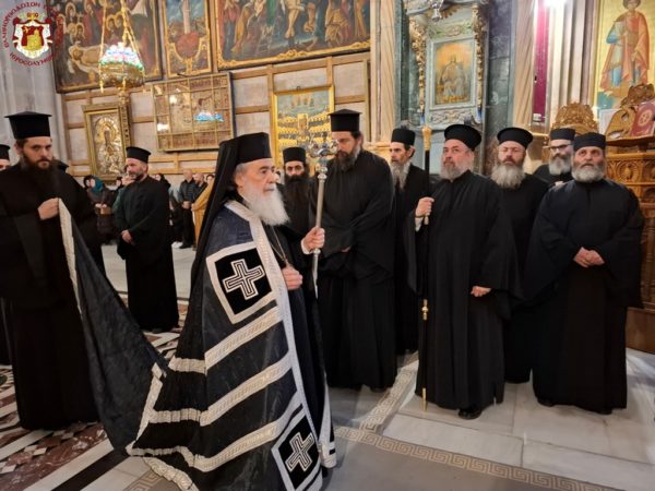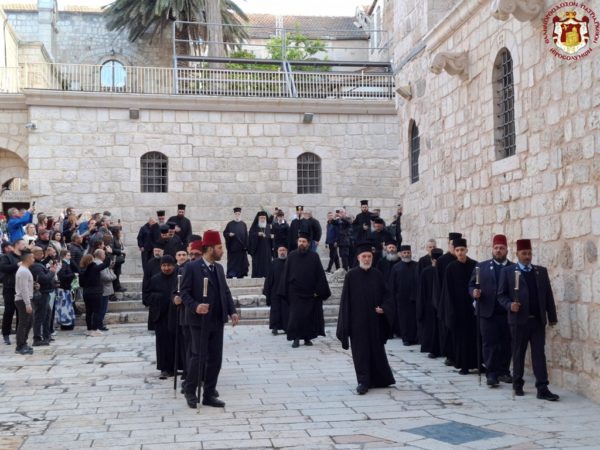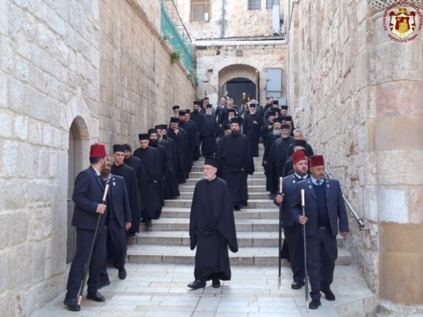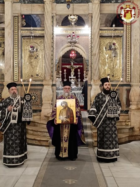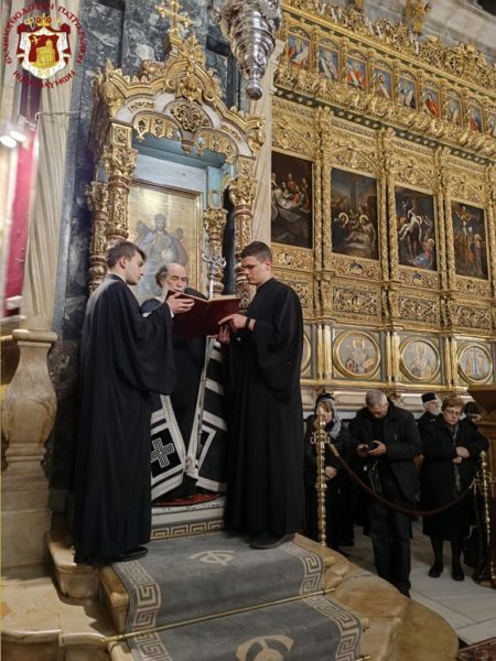 Στην Ακολουθία προεξήρξε ο Μακαριώτατος Πατριάρχης Ιεροσολύμων κ.κ. Θεόφιλος, συνιερουργούντων των Αγιοταφιτών Ιερομονάχων και Ιεροδιακόνων, ων πρώτος ο Γέρων Καμαράσης Αρχιμανδρίτης π. Νεκτάριος, ψάλλοντος ελληνιστί του Πρωτοψάλτου διακόνου π. Ευσταθίου και ψαλτών παρεπιδημούντων εξ Ελλάδος, βοηθούντος εις τους Αίνους του Σεβασμιωτάτου Μητροπολίτου Ελενουπόλεως κ. Ιωακείμ.