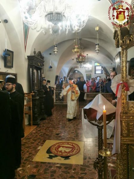 Εἰς τήν ἑορτήν αὐτήν ἔλαβε χώραν ὁ Ὄρθρος, ψαλλομένου τοῦ Ἀναστασίμου Κανόνος τοῦ Ἁγίου Ἰωάννου τοῦ Δαμασκηνοῦ «Ἀναστάσεως Ἡμέρα» καί θεία Λειτουργία Ἀναστάσιμος καί πανηγυρική, προεξάρχοντος ἐν χοροστασίᾳ τοῦ Μακαριωτάτου Πατρός ἡμῶν καί Πατριάρχου Ἱεροσολύμων κ.κ. Θεοφίλου, λειτουργοῦντος τοῦ Τυπικάρη τοῦ Ἱεροῦ Ναοῦ αὐτοῦ Ἀρχιμανδρίτου π. Ἀλεξίου καί τοῦ Ἀρχιδιακόνου π. Μάρκου.
