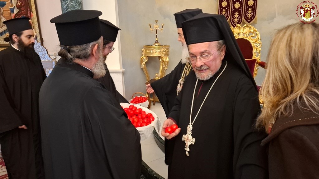 Ληξάσης τῆς θείας Λειτουργίας, ἡ Πατριαρχικὴ Συνοδεία ἀνῆλθεν εἰς τὰ Πατριαρχεῖα ἐν χαρμοσύνῳ ψαλμῳδίᾳ ὑπό τοῦ Ἱεροψάλτου διακόνου π. Εὐσταθίου καί τῶν βοηθῶν αὐτοῦ, ἔνθα ἔλαβε χώραν ὁ Πατριαρχικὸς ἀδελφικὸς ἀσπασμὸς τῆς ἀγάπης καὶ ὁ Μακαριώτατος διένειμε τὰ πασχάλια ᾠὰ εἰς τὴν Ἀδελφότητα, τὰς μοναχὰς καὶ πάντας τοὺς προσκυνητάς, τῶν ὁποίων ἡ προσέλευσις ἦτο μεγαλυτέρα, λόγῳ τῆς ἐκεχειρίας τοῦ πολέμου.