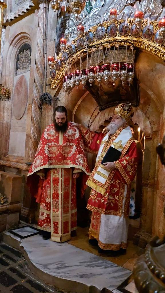 Εἰς νυκτερινήν θείαν Λειτουργίαν τῆς Κυριακῆς τῆς Σαμαρείτιδος, 5ης / 18ης Μαΐου 2025, εἰς τόν Πανάγιον Τάφον ἐχειροτονήθη εἰς Πρεσβύτερον ὁ Γραμματεύς τῆς Ἁγίας καί Ἱερᾶς Συνόδου καί Ἱεροψάλτης τοῦ Ναοῦ τῆς Ἀναστάσεως Ἱερομόναχος π. Συμεών ὑπό τοῦ Πατριαρχικοῦ Ἐπιτρόπου Μητροπολίτου Καπιτωλιάδος κ. Ἡσυχίου, εὐλογίᾳ τῆς Α.Θ.Μ. τοῦ Πατρός ἡμῶν καί Πατριάρχου Ἱεροσολύμων κ.κ. Θεοφίλου.