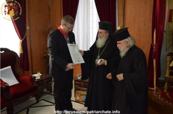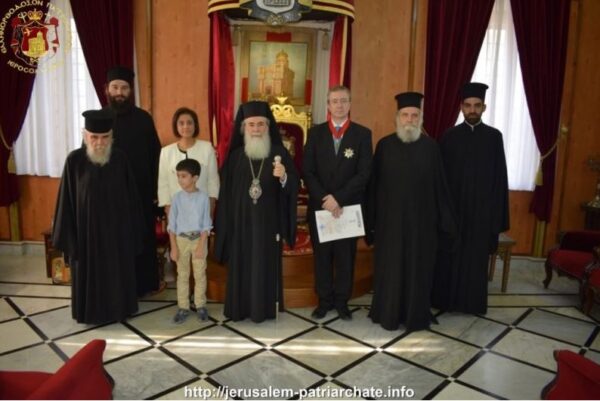 Τη στήριξη της Ελλάδας προς το Πατριαρχείο Ιεροσολύμων εξέφρασε ο νέος Γενικός Πρόξενος της χώρας μας στα Ιεροσόλυμα κ. Ευάγγελος Βλιώρας κατά τη χθεσινή του επίσημη επίσκεψη στο Πατριαρχείο. Σε αναγνώριση αυτής της στήριξης ο Μακαριώτατος Πατριάρχης Ιεροσολύμων κ.κ. Θεόφιλος του απένεμε το παράσημο του Ανωτέρου Ταξιάρχου του Τάγματος των Ιπποτών του Παναγίου Τάφου