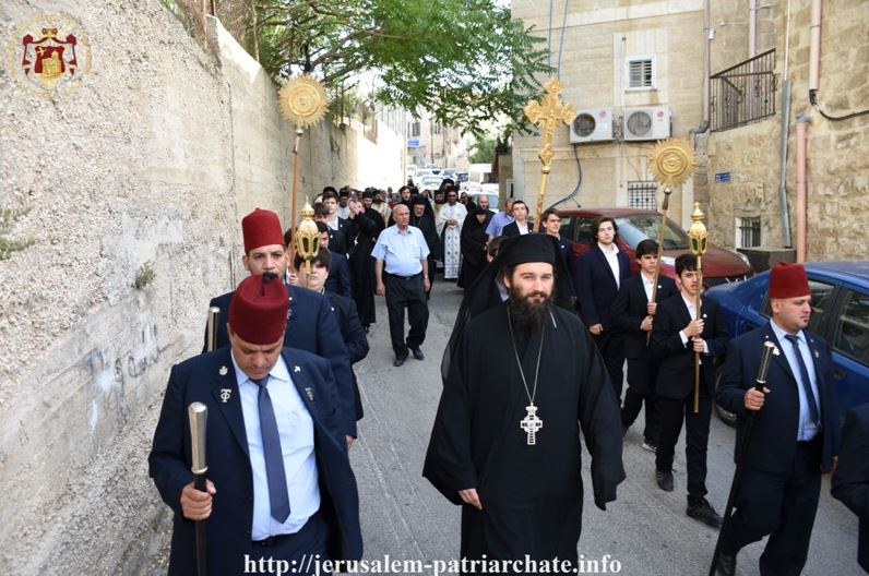 Ἑωρτάσθη δέ δι’ Ἑσπερινοῦ ἀφ’ ἑσπέρας προεξάρχοντος τοῦ Σεβασμιωτάτου Ἀρχιεπισκόπου Πέλλης κ. Φιλουμένου, συλλειτουργούντων Ἁγιοταφιτῶν Ἱερομονάχων, ὧν πρῶτος ὁ Γέρων Καμαράσης Ἀρχιμανδρίτης Νεκτάριος, τῶν Πρεσβυτέρων τοῦ Καθεδρικοῦ Ναοῦ τοῦ Ἁγίου Ἰακώβου τοῦ Ἀδελφοθέου, ψάλλοντος τοῦ Πρωτοψάλτου τοῦ Πανιέρου Ναοῦ τῆς Ἀναστάσεως κ. Κωνσταντίνου Σπυροπούλου δεξιά ἑλληνιστί καί τοῦ κ. Ριμόν Κάμαρ ἀριστερά ἀραβιστί.