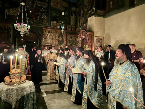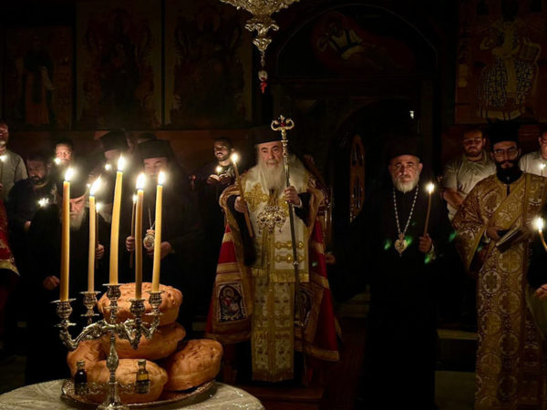 Στο Καθολικό της Ιεράς Μονής του Αγίου Σάββα τελέσθηκε Ιερά Αγρυπνία, της οποίας προεξήρξεν ο Πατριάρχης Ιεροσολύμων κ.κ. Θεόφιλος, συλλειτουργούντων του Γέροντος Σκευοφύλακος Σεβασμιωτάτου Αρχιεπισκόπου Ιεραπόλεως κ. Ισιδώρου, του Γέροντος Αρχιγραμματέως Σεβασμιωτάτου Αρχιεπισκόπου Κωνσταντίνης κ. Αριστάρχου, του Ηγουμένου της Γεθσημανής Σεβασμιωτάτου Μητροπολίτου Ελενουπόλεως κ. Ιωακείμ, του Πνευματικού της Ιεράς Μονής του Οσίου Σάββα του Ηγιασμένου Αρχιμανδρίτου π. Ευδοκίμου και άλλων Αγιοταφιτών Ιερομονάχων, ως του εκπροσώπου της Ιεράς Μονής Χοζεβά Ιερομονάχου π. Χρυσογόνου και Αραβοφώνων Πρεσβυτέρων, του Αρχιδιακόνου π. Μάρκου και του Ιεροδιακόνου π. Πατρικίου, ψαλλόντων του Γραμματέως της Αγίας και Ιεράς Συνόδου Ιεροδιακόνου π. Συμεών δεξιά ελληνιστί και της χορωδίας υπό τον κ. Ηλίαν αριστερά αραβιστί και αθρόων πιστών εκ των κατεχομένων περιοχών της περιοχής Βηθλεέμ.