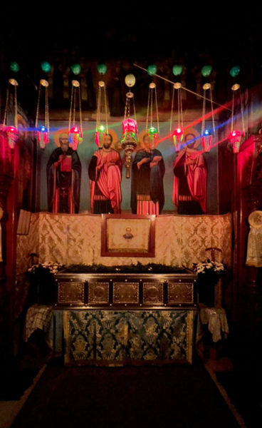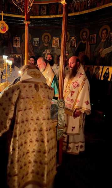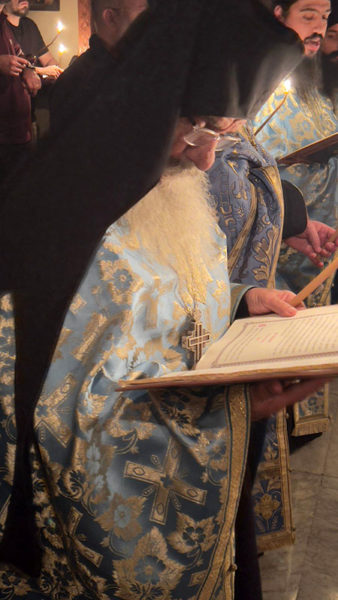 Στο Καθολικό της Ιεράς Μονής του Αγίου Σάββα τελέσθηκε Ιερά Αγρυπνία, της οποίας προεξήρξεν ο Πατριάρχης Ιεροσολύμων κ.κ. Θεόφιλος, συλλειτουργούντων του Γέροντος Σκευοφύλακος Σεβασμιωτάτου Αρχιεπισκόπου Ιεραπόλεως κ. Ισιδώρου, του Γέροντος Αρχιγραμματέως Σεβασμιωτάτου Αρχιεπισκόπου Κωνσταντίνης κ. Αριστάρχου, του Ηγουμένου της Γεθσημανής Σεβασμιωτάτου Μητροπολίτου Ελενουπόλεως κ. Ιωακείμ, του Πνευματικού της Ιεράς Μονής του Οσίου Σάββα του Ηγιασμένου Αρχιμανδρίτου π. Ευδοκίμου και άλλων Αγιοταφιτών Ιερομονάχων, ως του εκπροσώπου της Ιεράς Μονής Χοζεβά Ιερομονάχου π. Χρυσογόνου και Αραβοφώνων Πρεσβυτέρων, του Αρχιδιακόνου π. Μάρκου και του Ιεροδιακόνου π. Πατρικίου, ψαλλόντων του Γραμματέως της Αγίας και Ιεράς Συνόδου Ιεροδιακόνου π. Συμεών δεξιά ελληνιστί και της χορωδίας υπό τον κ. Ηλίαν αριστερά αραβιστί και αθρόων πιστών εκ των κατεχομένων περιοχών της περιοχής Βηθλεέμ.