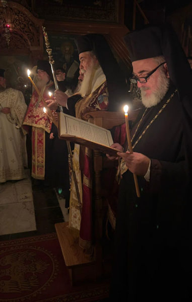 Διά τό ἱστορικόν καί λίαν σημαντικόν γεγονός τοῦτο ἔλαβε χώραν εἰς τό Καθολικόν τῆς Ἱερᾶς Μονῆς τοῦ Ἁγίου Σάββα ἀγρυπνία, τῆς ὁποίας προεξῆρξεν ἡ Α.Θ.Μ. ὁ Πατήρ ἡμῶν καί Πατριάρχης Ἱεροσολύμων κ.κ. Θεόφιλος, συλλειτουργούντων Αὐτῷ τοῦ Γέροντος Σκευοφύλακος Σεβασμιωτάτου Ἀρχιεπισκόπου Ἱεραπόλεως κ. Ἰσιδώρου, τοῦ Γέροντος Ἀρχιγραμματέως Σεβασμιωτάτου Ἀρχιεπισκόπου Κωνσταντίνης κ. Ἀριστάρχου, τοῦ Ἡγουμένου τῆς Γεθσημανῆς Σεβασμιωτάτου Μητροπολίτου Ἑλενουπόλεως κ. Ἰωακείμ, τοῦ Πνευματικοῦ τῆς Ἱερᾶς Μονῆς τοῦ Ὁσίου Σάββα τοῦ Ἡγιασμένου Ἀρχιμανδρίτου π. Εὐδοκίμου καί ἄλλων Ἁγιοταφιτῶν Ἱερομονάχων, ὡς τοῦ ἐκπροσώπου τῆς Ἱερᾶς Μονῆς Χοζεβᾶ Ἱερομονάχου π. Χρυσογόνου καί Ἀραβοφώνων Πρεσβυτέρων, τοῦ Ἀρχιδιακόνου π. Μάρκου καί τοῦ Ἱεροδιακόνου π. Πατρικίου, ψαλλόντων τοῦ Γραμματέως τῆς Ἁγίας καί Ἱερᾶς Συνόδου Ἱεροδιακόνου π. Συμεών δεξιά ἑλληνιστί καί τῆς χορῳδίας ὑπό τόν κ. Ἠλίαν ἀριστερά ἀραβιστί καί ἀθρόων πιστῶν ἐκ τῶν κατεχομένων περιοχῶν τῆς περιοχῆς Βηθλεέμ.