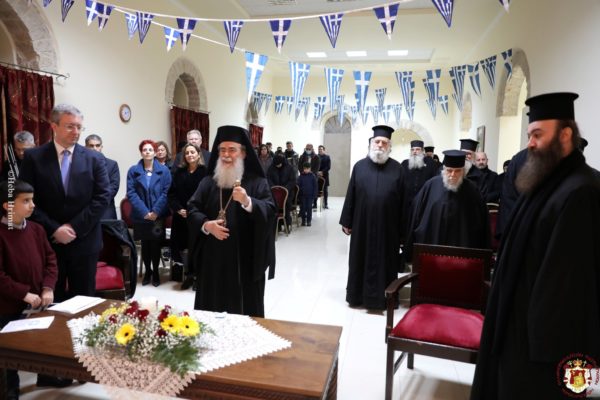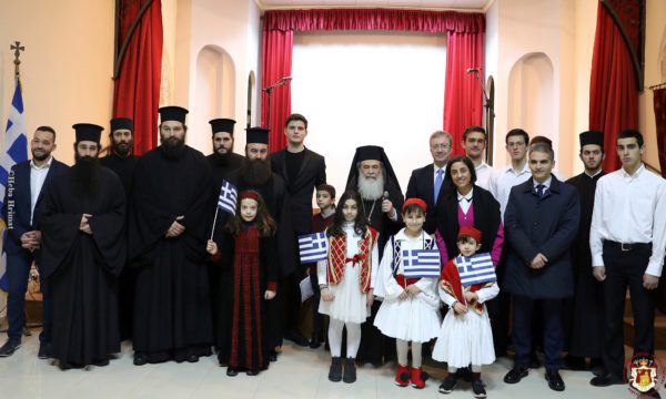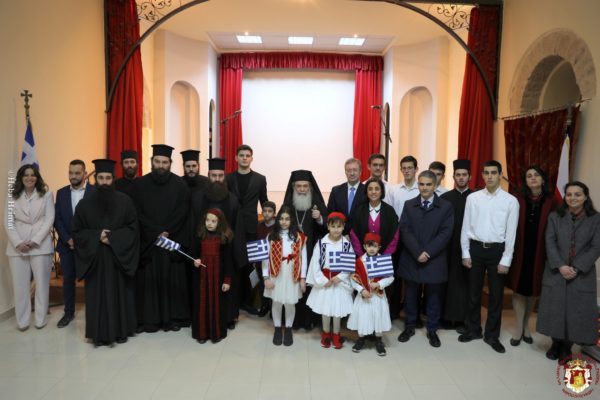 Παρουσία του Μακαριωτάτου Πατριάρχη Ιεροσολύμων κ.κ. Θεοφίλου πραγματοποιήθηκε η εορτή για την Εθνική Επέτειο της 25ης Μαρτίου στην Πατριαρχική Σχολή της Σιών το απόγευμα της Πέμπτης 24 Μαρτίου 2022.