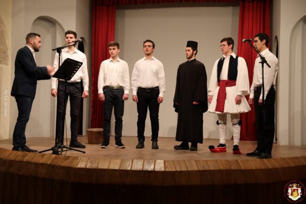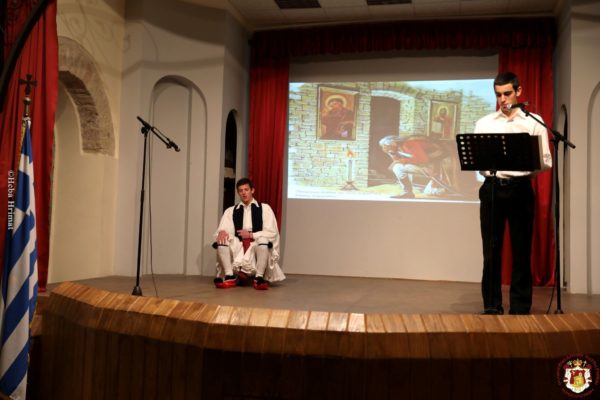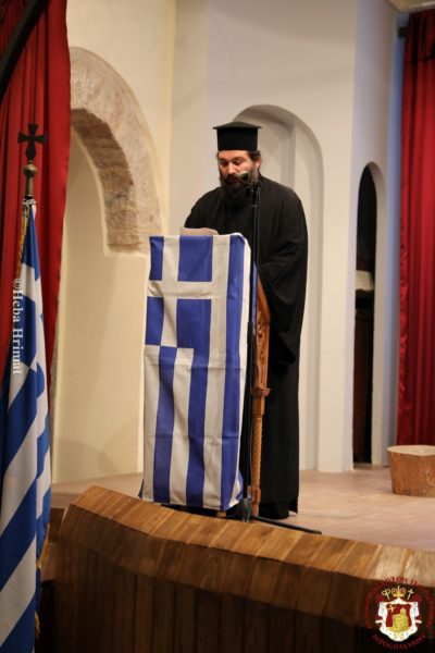 Η τελετή περιλάμβανε ομιλία του Σχολάρχη, εκφώνηση του πανηγυρικού της ημέρας από τον Γραμματέα της Αγίας και Ιεράς Συνόδου Ιεροδιάκονο π. Συμεών, καθώς και τραγούδια και απαγγελίες ποιημάτων από τους μαθητές υπό την επιμέλεια του Βασιλείου Γκοτσοπούλου.