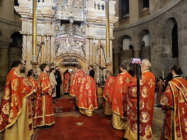 Κατά την Θεία Λειτουργία που τελέστηκε στον Πανάγιο Τάφο προεξάρχοντος του Πατριάρχη Ιεροσολύμων κ.κ. Θεοφίλου, συλλειτούργησαν ο Μητροπολίτης Καπιτωλιάδος κ. Ησύχιος, οι Σεβ. Αρχιεπίσκοποι Γεράσων κ. Θεοφάνης, Κωνσταντίνης κ. Αρίσταρχος και Λύδδης κ. Δημήτριος, καθώς και Αγιοταφίτες Πατέρες.