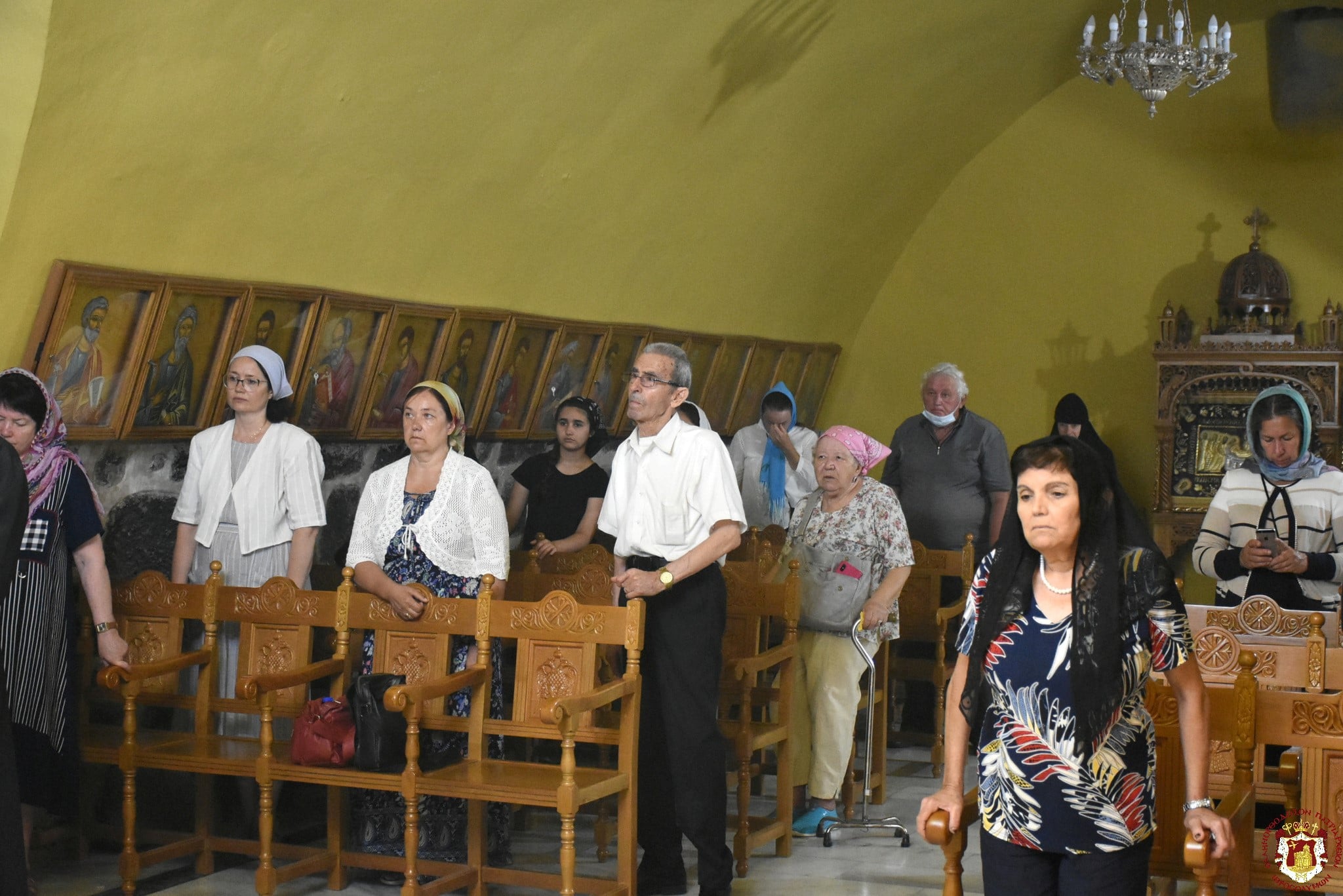 Ἐνταῦθα, ἀνήμερα τῆς ἑορτῆς προεξῆρξε τῆς θείας Λειτουργίας ὁ Μακαριώτατος Πατήρ ἡμῶν καί Πατριάρχης Ἱεροσολύμων κ.κ. Θεόφιλος, συλλειτουργούντων Αὐτῷ τοῦ Σεβασμιωτάτου Μητροπολίτου Ναζαρέτ κ. Κυριακοῦ καί τοῦ Σεβασμιωτάτου Ἀρχιεπισκόπου Κωνσταντίνης κ. Ἀριστάρχου, Ἁγιοταφιτῶν Ἱερομονάχων ὡς τοῦ Γέροντος Καμαράση Ἀρχιμανδρίτου π. Νεκταρίου, καί τῶν Ἀρχιμανδριτῶν π. Χρυσοστόμου καί π. Ἀρτεμίου, Ἀραβοφώνων Πρεσβυτέρων τῆς περιοχῆς Ναζαρέτ, τοῦ Ἀρχιδιακόνου π. Μάρκου καί τοῦ Ἱεροδιακόνου π. Εὐλογίου, ψαλλούσης τῆς χορῳδίας τῆς Ἄκκρης ὑπό τόν Ἀρχιμανδρίτην π. Φιλόθεον καί μετεχόντων Ρωσοφώνων καί Ἀραβοφώνων πιστῶν.