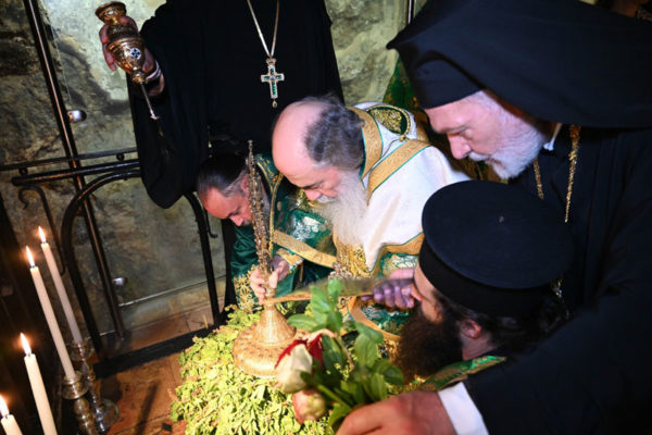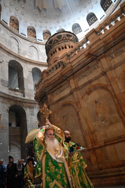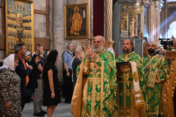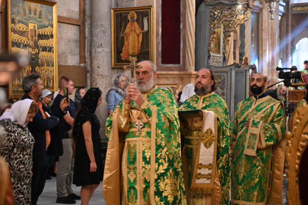 Το πρωί της εορτής, Παρασκευή,27 Σεπτεμβρίου 2024, τελέσθηκε θεία Λειτουργία στο Καθολικό του Πανίερου Ναού της Αναστάσεως, προεξάρχοντος του Μακαριωτάτου Πατριάρχου Ιεροσολύμων κ.κ. Θεοφίλου και συλλειτουργούντων του Σεβασμιωτάτου Μητροπολίτου Καπιτωλιάδος κ. Ησυχίου, των Σεβασμιωτάτων Αρχιεπισκόπων Γεράσων κ. Θεοφάνους, Αβήλων κ. Δωροθέου, Κωνσταντίνης κ. Αριστάρχου, Θαβωρίου κ. Μεθοδίου, Σεβαστείας κ. Θεοδοσίου, Λύδδης κ. Δημητρίου και Μαδάβων κ. Αριστοβούλου, Αγιοταφιτών Ιερομονάχων, εκ των οποίων, πρώτος ο Γέρων Καμαράσης Αρχιμανδρίτης π. Νεκτάριος, των Αρχιμανδριτών Κλαυδίου, Φιλουμένου, Αμφιλοχίου, Ραφαήλ, Μακαρίου, Διονυσίου, Μελετίου, Χριστοδούλου, του Προισταμένου της Ρωσικής Πνευματικής Αποστολής (MISSIA) εις Ιεροσόλυμα Αρχιμανδρίτου π. Βασιανού, του εκπροσώπου του Πατριαρχείου Ρουμανίας π. Ιωάννου, ιερέων άλλων Ορθοδόξων Εκκλησιών, του Πρεσβυτέρου π. Γεωργίου εκ του Ναού του Αγίου Ιακώβου του Αδελφοθέου, του Πρεσβυτέρου π. Νεκταρίου, των παρεπιδημούντων Ιερέων π. Δημητρίου, π. Στεφάνου και π. Χαραλάμπους, του Αρχιδιακόνου π. Μάρκου και του Ιεροδιακόνου π. Δοσιθέου, ψάλλοντος του Πρωτοψάλτου του Πανιέρου Ναού της Αναστάσεως κ. Ευσταθίου Τσουμάνη, με τη συμμετοχή ντόπιου ευσεβούς εκκλησιάσματος, παρουσία της Προξένου κ. Άννης Μάντικα και μελών του Ελληνικού Γενικού Προξενείου εις Ιεροσόλυμα.