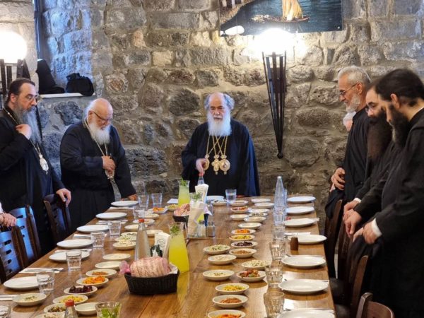 Μετά τήν Ἀπόλυσιν τῆς θείας Λειτουργίας παρέθεσε μικράν δεξίωσιν καί μετ’ αὐτήν παραδοσιακήν τράπεζαν ἐξ ἰχθύων ἐκ τῆς Τιβεριάδος θαλάσσης ὁ καλῶς ἐπιμελούμενος τῶν τῆς Μονῆς Ἡγούμενος Ἀρχιμανδρίτης π. Νικόδημος.
