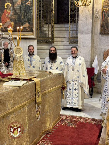 Επί τη μνήμη των Εγκαινίων τελέσθηκε θεία Λειτουργία στο Καθολικό του Πανίερου Ναού της Αναστάσεως, προεξάρχοντος του Σεβασμιωτάτου Μητροπολίτου Καπιτωλιάδος κ. Ησυχίου, συλλειτουργούντων των Αγιοταφιτών Ιερομονάχων π. Ραφαήλ Προισταμένου της Εξαρχίας του Παναγίου Τάφου στην Αθήνα, π. Κλαυδίου, π. Διονυσίου, π. Αμφιλοχίου, π. Χριστοδούλου, των Ιερέων π. Στεφάνου και π. Νεκταρίου, του Αρχιδιακόνου π. Μάρκου και Ιεροδιακόνου π. Συμεών, ψάλλοντος του Πρωτοψάλτου του Ναού κ. Ευσταθίου Τσουμάνη και μετέχοντος μικρού εκκλησιάσματος ευλαβών πιστών της Εκκλησίας Ιεροσολύμων.
