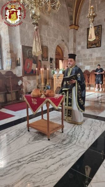 Οι ιερές ακολουθίες τελέστηκαν προεξάρχοντος του Σεβασμιωτάτου Αρχιεπισκόπου Κωνσταντίνης κ. Αριστάρχου και συλλειτουργούντος του Ιερομονάχου π. Σίλα, του Πρεσβυτέρου Αθανασίου, του Ιεροδιακόνου π. Συμεών, ψάλλοντος του Ιεροψάλτου κ. Δημητρίου Μανούση, βοηθούντων των μαθητών Πατριαρχικής Σχολής Σιών και προσευχομένων και εν ευσεβεία και ευλαβεία πληρούντων τον Ναόν μοναχών, μοναζουσών, προσκυνητών και των εκπροσώπων του Ελληνικού Γενικού Προξενείου εις Ιεροσόλυμα κ. Χριστίνης Ζαχαριουδάκη και Κωνσταντίνας Γύφτου.