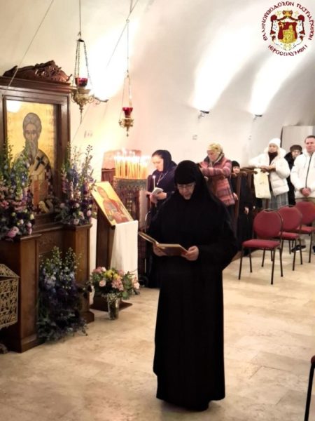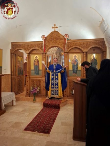Προς τιμή του Αγίου τελέσθηκε Εσπερινός προεξάρχοντος του Αρχιμανδρίτη π. Δοσίθεου και θεία Λειτουργία, της οποίας προεξήρξεν ο Αρχιμανδρίτης π. Αμφιλόχιος, συλλειτουργούντος του διακόνου π. Ευσταθίου και ψάλλοντος του Ιεροδιακόνου π. Προδρόμου και της μοναχής Ευφημίας, τη συμμετοχή μοναζουσών, της αντιπροσώπου του Γενικού Προξενείου κ. Αθανασίας Μάλιου και άλλων Ιεροσολυμιτών πιστών.
