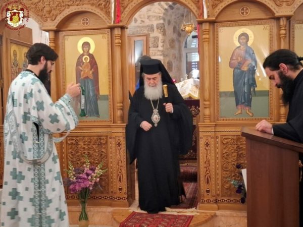Διαρκούσης τῆς θείας Λειτουργίας προσῆλθε πρός προσκύνησιν ὁ Μακαριώτατος Πατήρ ἡμῶν καί Πατριάρχης Ἱεροσολύμων κ.κ. Θεόφιλος μετά Πατέρων Ἁγιοταφιτῶν.