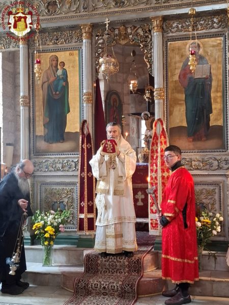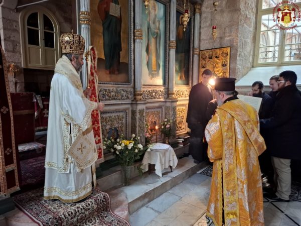 Διαρκούσης τῆς θείας Λειτουργίας προσῆλθε διά προσκύνησιν ἡ Α.Θ.Μ. ὁ Πατήρ ἡμῶν καί Πατριάρχης Ἱεροσολύμων κ.κ. Θεόφιλος μετά Πατέρων Ἁγιοταφιτῶν.