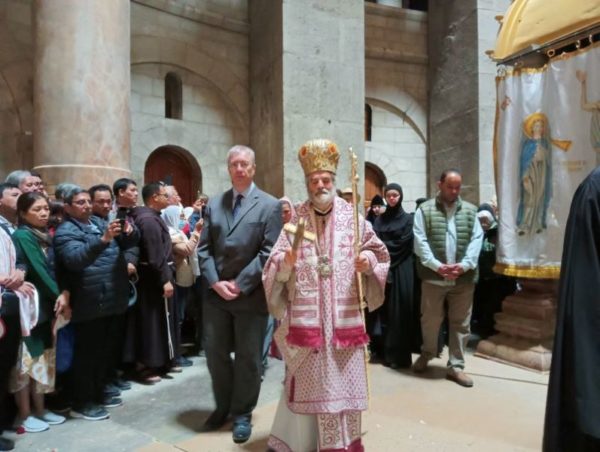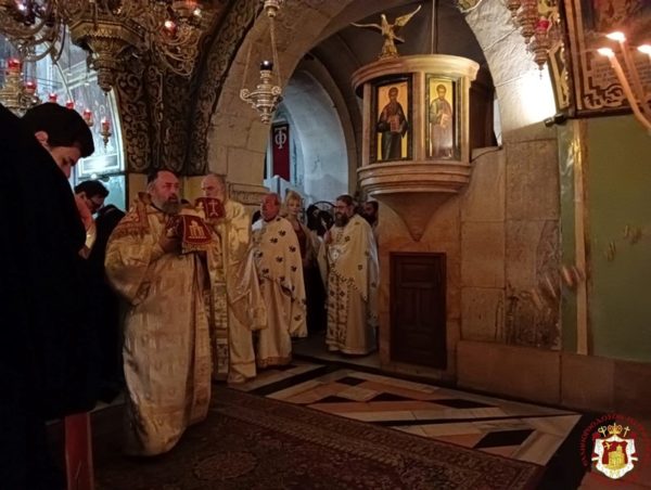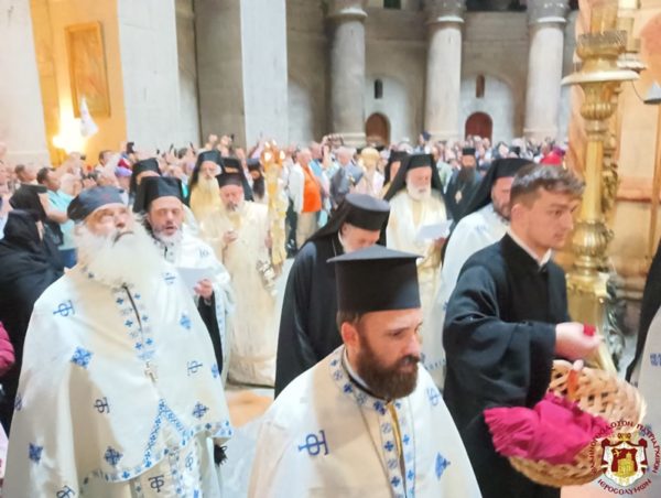 Μετά την Απόλυση της Θείας Λειτουργίας ξεκίνησε από το Προσκύνημα της Αγίας Αποκαθηλώσεως λιτανεία τρεις φορές πέριξ του Παναγίου Τάφου με τη συμμετοχή των Αρχιερέων της Αδελφότητος και του εκκλησιάσματος.