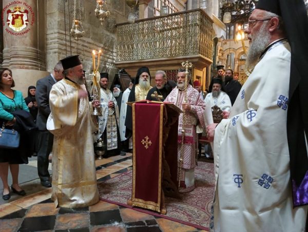 Στη συνέχεια προ του Κουβουκλίου του Αγίου Τάφου ανεγνώσθηκε το Ιερό Ευαγγέλιο της Αναστάσεως και η επιστολή του Αρχιεπισκόπου Κυρίλλου στα ελληνικά και στα αραβικά η οποία περιγράφει το γεγονός και παρατίθεται παρακάτω: