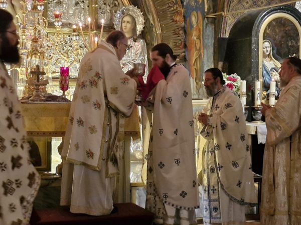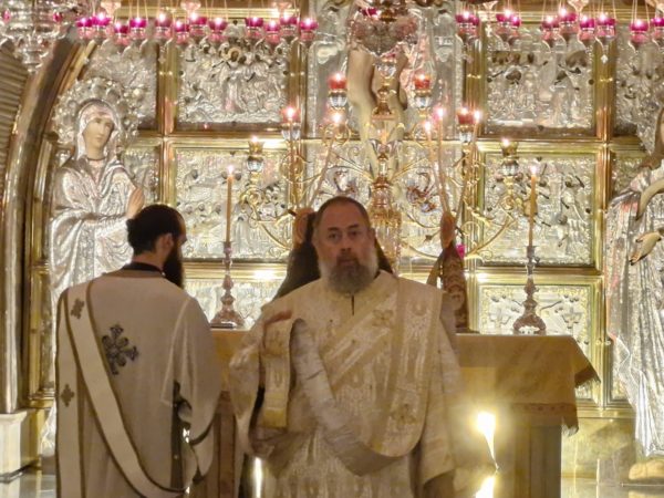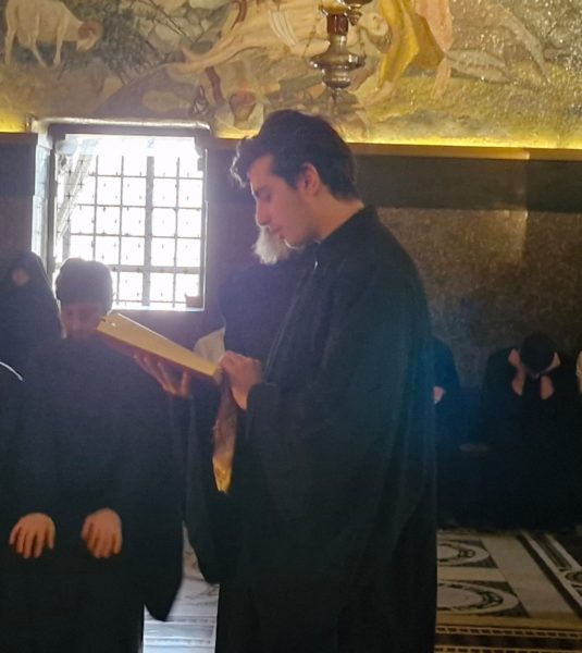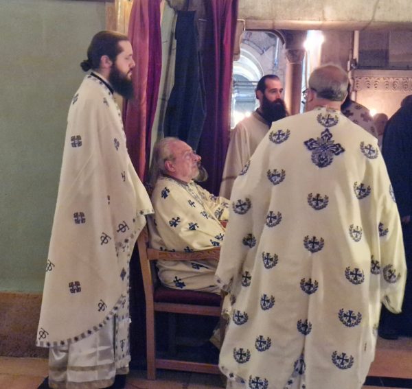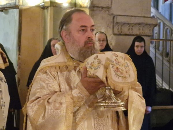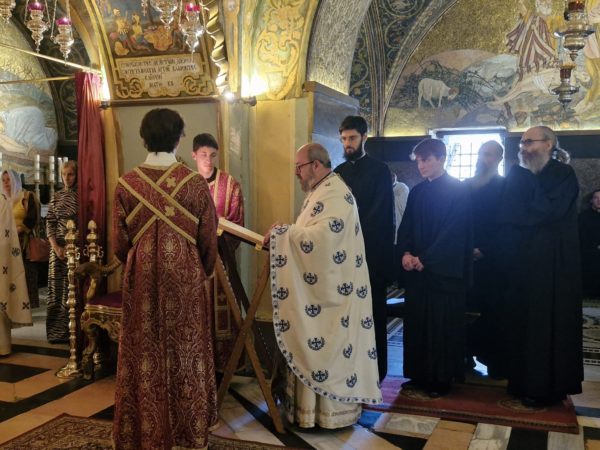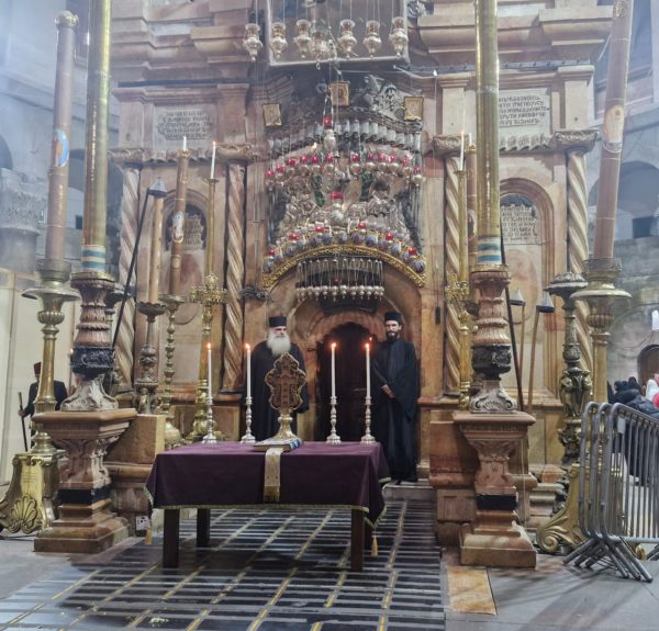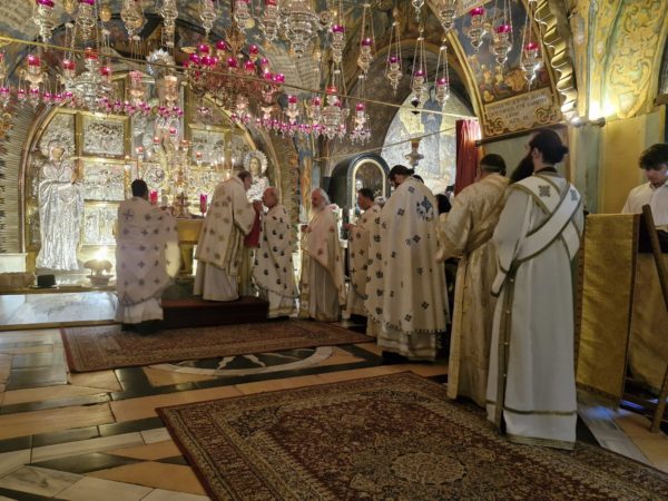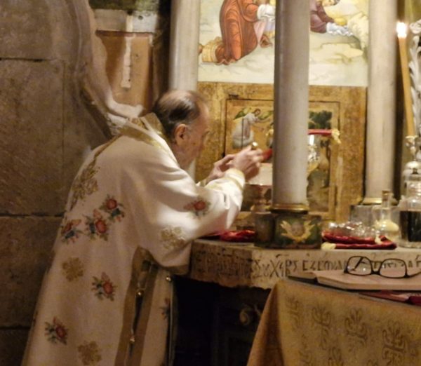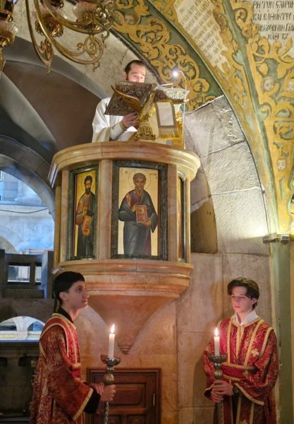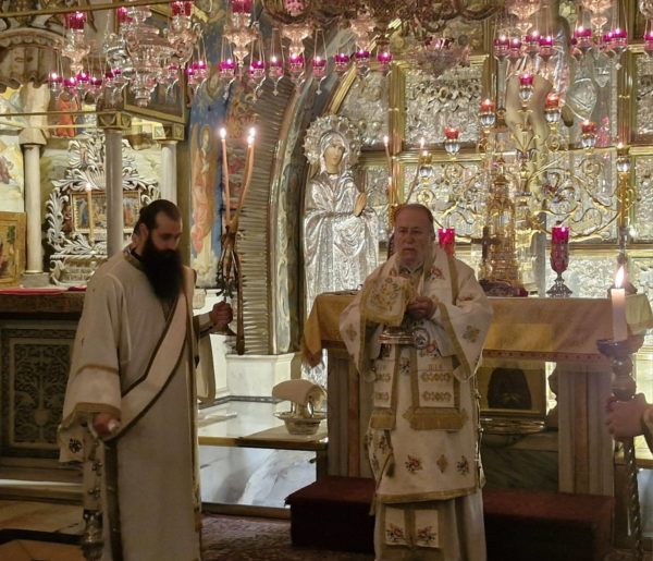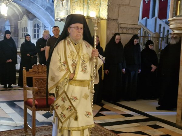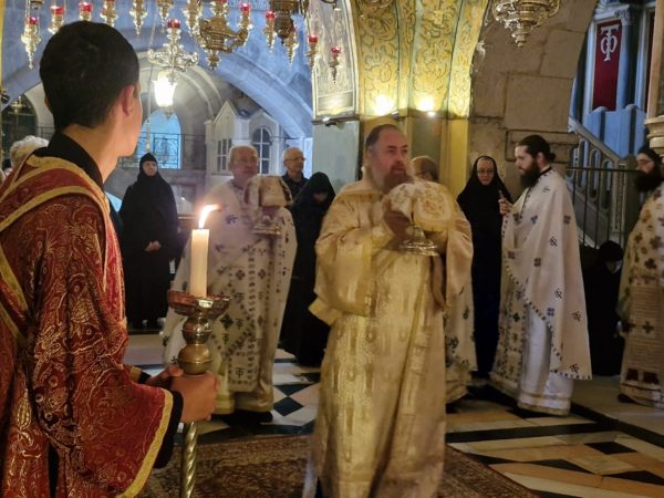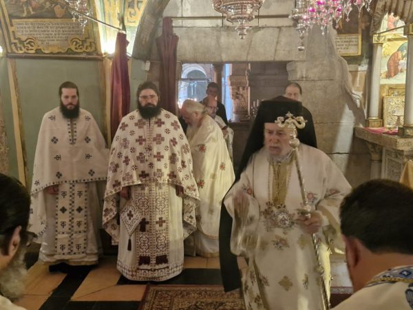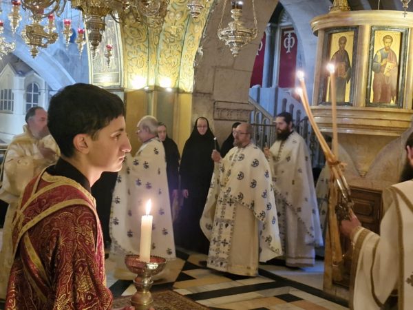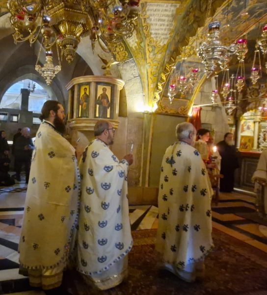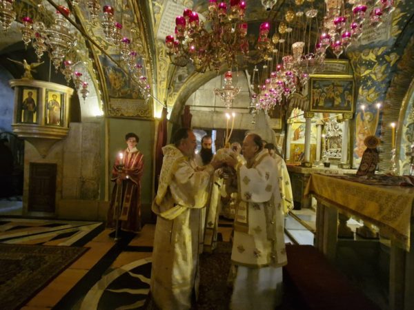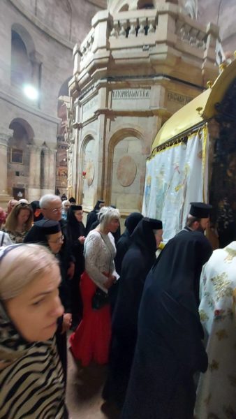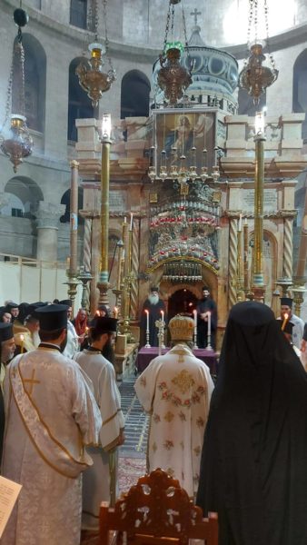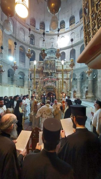 Στη Θεία Λειτουργία συμμετείχαν συμπροσευχόμενοι μοναχοί, μοναχές και κάτοικοι των Ιεροσολύμων.