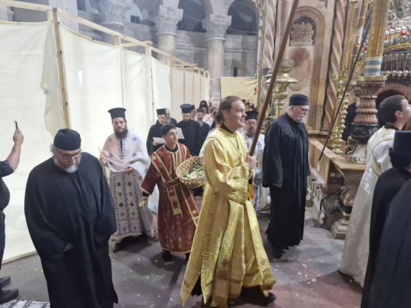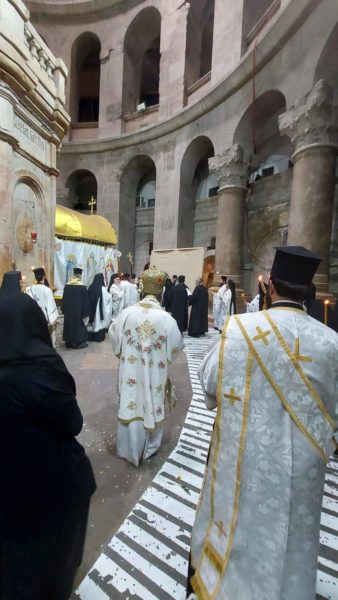 Μετά την απόλυση της Θείας Λειτουργίας, η Αρχιερατική Συνοδεία κατήλθε στην Αγία Αποκαθήλωση, όπου προσήλθαν οι Αρχιερείς του Πατριαρχείου και ακολούθησε λιτανεία τρεις φορές πέριξ του Αγίου Τάφου.