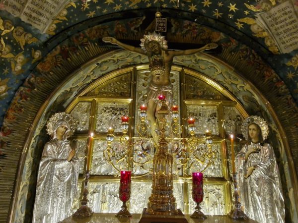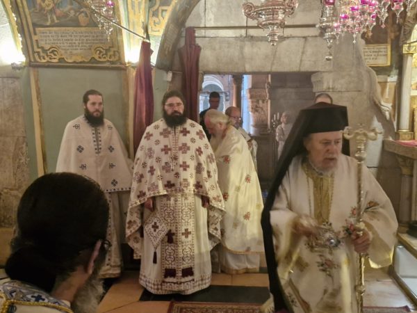Το πρωί της εορτής τελέστηκε Θεία Λειτουργία επί του Φρικτού Γολγοθά, προεξάρχοντος του Σεβασμιωτάτου Αρχιεπισκόπου Αβήλων κ. Δωροθέου, συλλειτουργούντων Αγιοταφιτών Ιερομονάχων, των Αρχιμανδριτών π. Φιλουμένου, π. Κλαυδίου, π. Αμφιλοχίου του νεοχειροτονηθέντος Πρεσβυτέρου π. Συμεών, του εφημερίου του Πανιέρου Ναού της Αναστάσεως Αρχιμανδρίτου π. Θαδδαίου και του εφημερίου του Καθεδρικού Ναού του Αγίου Ιακώβου του Αδελφοθέου π. Χαραλάμπους – Φάραχ Μπαντούρ και του π. Νεκταρίου, του Αρχιδιακόνου π. Μάρκου και του Ιεροδιακόνου π. Δοσιθέου.