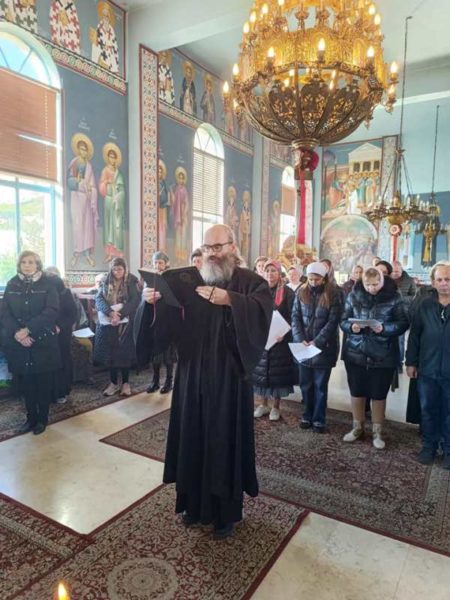 Της θείας Λειτουργίας προεξήρχε ο Σεβασμιώτατος Αρχιεπίσκοπος Μαδάβων κ. Αριστόβουλος, συλλειτουργούντων του Γέροντος Καμαράση Αρχιμανδρίτου π. Νεκταρίου, του Ιερέως της Κοινότητος Μπερ Σέβα π. Αλεξάνδρου, του Πρεσβυτέρου π. Νεκταρίου και του Ιεροδιακόνου π. Αναστασίου, ψαλλόντων του π. Ιωάννου και του μοναχού Ιωσήφ του Αγιορείτου στα ελληνικά ελληνιστί και της χορωδίας της Κοινότητος Μπερ Σέβα, στα ρωσικά, αραβικά και ρουμανικά.
