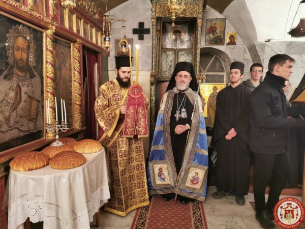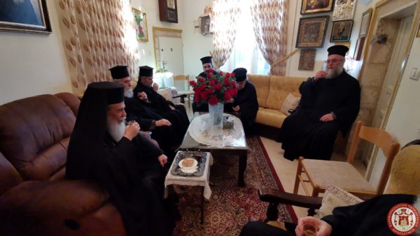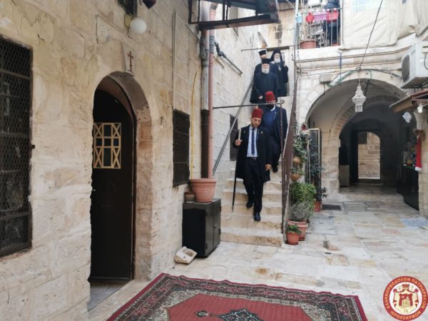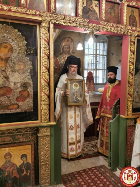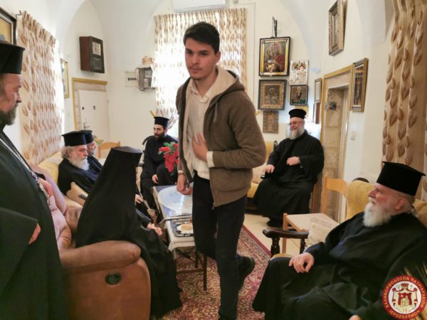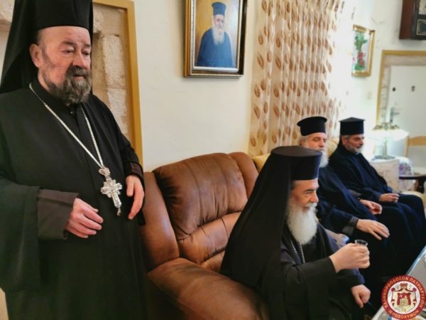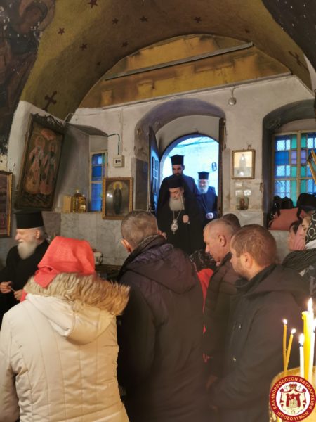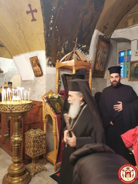 Κατά τη διάρκεια της θείας Λειτουργίας, ο Μακαριώτατος Πατριάρχης Ιεροσολύμων κ.κ. Θεόφιλος με Αγιοταφίτες Πατέρες πήγαν να προσκυνήσουν. Την Πατριαρχική και Αρχιερατική Συνοδεία εδεξιώθη στο ηγουμενείο ο καλώς επιμελούμενος των της Μονής ηγούμενος Αρχιμανδρίτης π. Σέργιος.