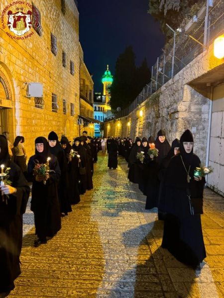 Της λιτανείας προπορεύονταν μοναχοί από πολλές ορθόδοξες χώρες. Έψαλλε ο Ιεροδιάκονος π. Συμεών μετ’ ενοριτών του Ναού του Αγίου Ιακώβου το «Απόστολοι εκ περάτων συναθροισθέντες ενθάδε…» και «εν τη γεννήσει την παρθενίαν εφύλαξας…».