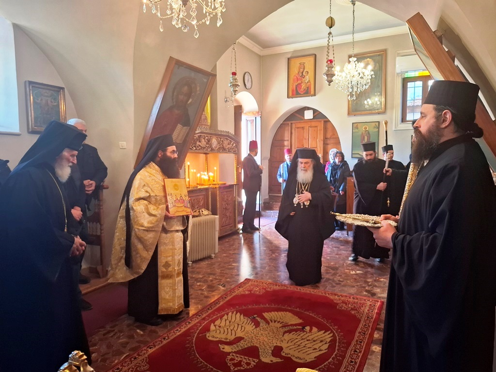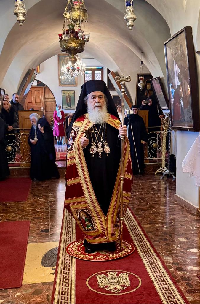 Ἡ προσκύνησις δέ καί ἀναστήλωσις τῶν ἁγίων εἰκόνων δέν ἀποτελεῖ ἁπλῶς ἱστορικόν γεγονός, ἀλλ΄ ἀφορᾷ εἰς τό μέγα μυστήριον τῆς θείας καί σωτηριώδους Οἰκονομίας. Διό καί ἡμεῖς, παρά τήν ἐπισυμβαίνουσαν πολεμικήν κρίσιν (καί τήν συνέπειαν αὐτῆς, μή δυνηθέντες νά κατέλθωμεν εἰς τόν Πανίερον Ναόν τῆς Ἀναστάσεως μετέβημεν εἰς τόν τοῦ κεντρικοῦ ἡμῶν Μοναστηρίου Ναόν τῶν ἁγίων Θεοστέπτων καί Μεγάλων Κωνσταντίνου καί Ἑλένης, ἔνθα ἐτελέσαμεν τήν «Μεγάλην Παρρησίαν» τῆς Α΄ Κυριακῆς τῶν Νηστειῶν, τοὐτέστιν τήν Πατριαρχικήν θείαν Λειτουργίαν , συλλειτουργούντων ἡμῖν τῶν Τιμίων μελῶν τῆς Ἁγιοταφιτικῆς ἡμῶν Ἀδελφότητος Ἀρχιερέων , Ἱερέων, Ἱεροδιακόνων καί συμπροσευχομένων μοναχῶν, μοναζουσῶν καί παρεπιδημούντων εὐλαβῶν προσκυνητῶν.